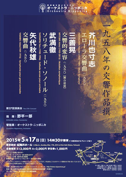 今日、日本の多くの識者や研究者が1958年に大きな注目を払っているという、これまたひとつの状況証拠になるだろう。1957年に柴田南雄が中心となって設立した20世紀音楽研究所が軸となって大志を持つ多くの作曲家たちがこのサークルを通して交流を深め、意欲的な作品を世に問う気運が高まったことも大きい。あるいは、団伊玖磨の「夕鶴」、黛敏郎の「涅槃交響曲」、芥川の上記の「エローラ交響曲」のように、日本人や日本民族に立脚した精神と題材で作曲する流れが生まれてきたことも無視できない。オーケストラ・ニッポニカはここに焦点を当てた。