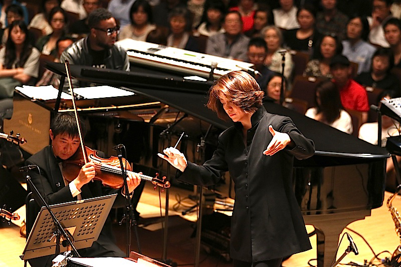 RGE とオケの響きが溶け合う瞬間は素晴らしかった。ケイシー・ベンジャミンのヴォコーダーは個人的にはそれほど得意ではないのだが、弦のハーモニーに溶けあうとむしろしっくり来たのは意外だった。マーク・コレンバーグは相変わらずの高速で緻密複雑なドラミングはRGEを特徴付け、会場を興奮させるが、その音は比較的クリアに響いていた。マークのファンは特に多いようだった。アール・トラヴィスのベースに関しては、自在でこの大人数のグルーヴを支えるプレイは素晴らしく、視覚的にも追えたが、PAがその音響を伝えきれなかった。PAはあまりよくなく、ステージ両脇のシンプルなスピーカーのセットから音を出すセッティングであったが、不明瞭な低音がまわってしまう中、肝心なベースの音は聴こえにくい状態。素人でわからないが、たとえば、より多くの場所にユニットを置いて小さめな音量で鳴らした方が残響の悪影響が出ないとか方法があるのだろうか?いや、響かないホールを会場に選ぶというオプションはむしろあったかもしれない。他方、メトロポールではピアノは客席に向けられており、少しでも、また視覚的にもアコースティックな響きを活かすという手もあった。岩城も東京芸術での音量調整、残響の難しさは実感したと語っていた。東京芸術劇場という残響が長いコンサートホールを空間に選んだ以上、より綿密なサウンドデザインは必須であったろう。