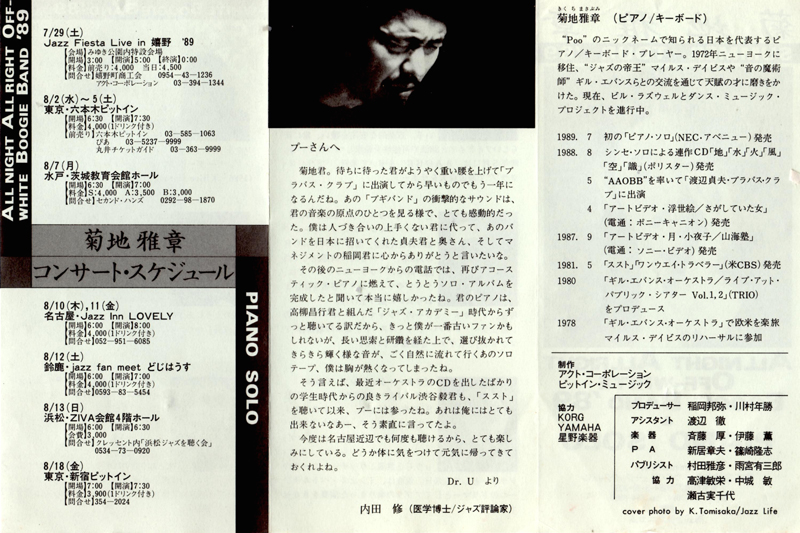 菊地君。待ちに待った君がようやく重い腰を上げて「ブラバス・クラブ」に出演してから早いものでもう一年になるんだね。あの「ブギバンド」の衝撃的なサウンドハは、君の音楽の原点のひとつを見る様で、とても感動的だった。僕は人づき合いの上手くない君に代わって、あのバンドを日本に招いてくれた貞夫君と奥さん、そしてマネジメントの稲岡君に心からありがとうと言いたいな。