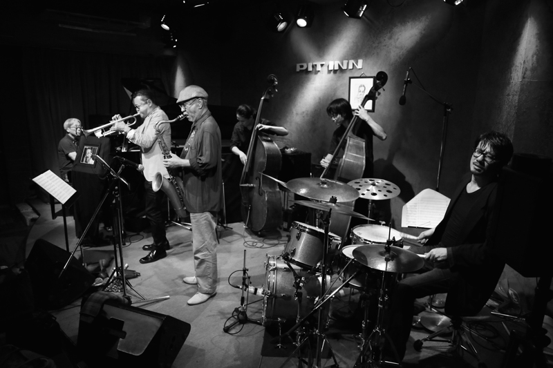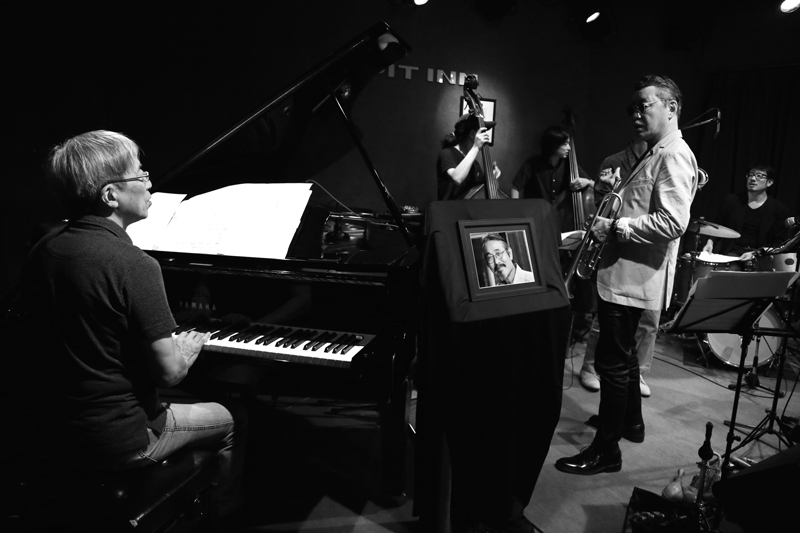 7月31日、新宿ピットインで追悼ライブ「We Love Poo」が行われた。元々は本田珠也3デイズの最終日として日野皓正さんとのデュオが企画されていたものを、急遽長年の盟友だった峰厚介さん、珠也とともにOn The Moveトリオを組んでいた杉本智和とNYで公私ともに多大な薫陶を受けた須川崇志の2人のベース、そして同世代の仲間としてピアノの佐藤允彦が加わり、プーさんの<驟雨><リトル・アビ><ダンシング・ミスト>が演奏された。カメラマンとしてファインダー越しにステージを見ていると、熱い演奏が繰り広げられるほどに菊地雅章という偉大なアーティストを失った寂寥感がこみ上げてくるのを抑えきれなかった。