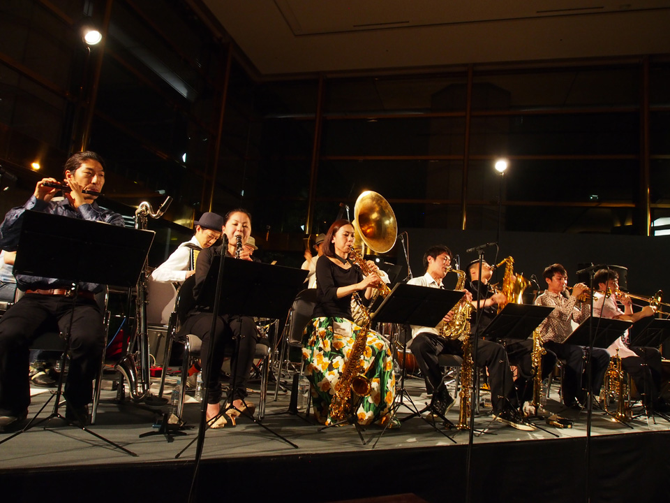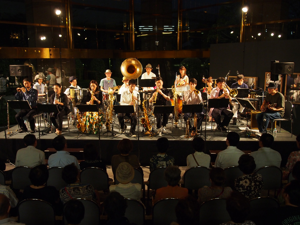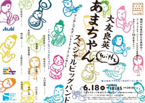 夕暮れどきの浅草・吾妻橋を渡りアサヒグループ本社ビルへ。浅草駅界隈からは東京スカイツリーと並んで見え、本社ビルはよく見るとジョッキと泡をイメージして作られているし、その隣には黄金の炎が載ったアサヒ・アートスクエアがある。日頃はがらんとした1階ロビーは483人の観客の熱気であふれ、突き当たりの角に大きなステージが設けられていた。もともと7月20日(土)に開催される「アンサンブルズ・パレード/すみだ川音楽解放区」を盛り上げるために、大友良英と仲間たち、特に元チャンチキトルネエド(CHANCHIKI TORNADE)のメンバーとのライブを、1990年から続くアサヒビールロビーコンサートの第118回目として行う予定であった。今まさに大友がNHK朝ドラ「あまちゃん」の音楽に全力を注ぎ、その劇伴録音の中心メンバーと重なるため「大友良英 with あまちゃんスペシャルビッグバンド」となった、そして記念すべきその初ライブとなり、観覧者募集をかけたところ2,809名が応募するプラチナチケットになってしまった(入場無料だが市民パトロネージュ制、いわゆる投げ銭)。7月2日の渋谷PARCO劇場でのレコ発コンサートは、先行予約だけで3,000人を超え、一般発売は1分で売り切れたとか。つまり両公演を合わせると東京国際フォーラム「ホールA」を満席にするだけの規模になる。6月19日発売のオリジナル・サウンドトラックは、発売初日オリコン5位に、最初の2日間で約25,000枚が売れた。大友が生んだ「あまちゃん」の音楽は今まさに「じぇじぇじぇ」な状況にある。